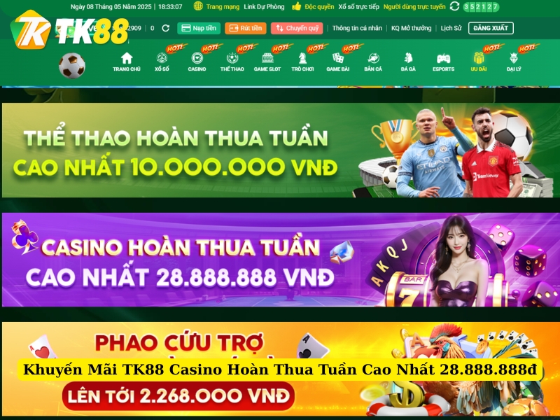 Khuyến mãi TK88 luôn khiến anh em phải trầm trồ, và chương trình Casino hoàn thua tuần chính là một trong những ưu đãi nổi bật. Với số tiền hoàn lại lên tới 28.888.888đ mỗi tuần, anh em có thể tiếp tục tham gia các trò chơi casino yêu thích mà không lo về khoản thua cược.