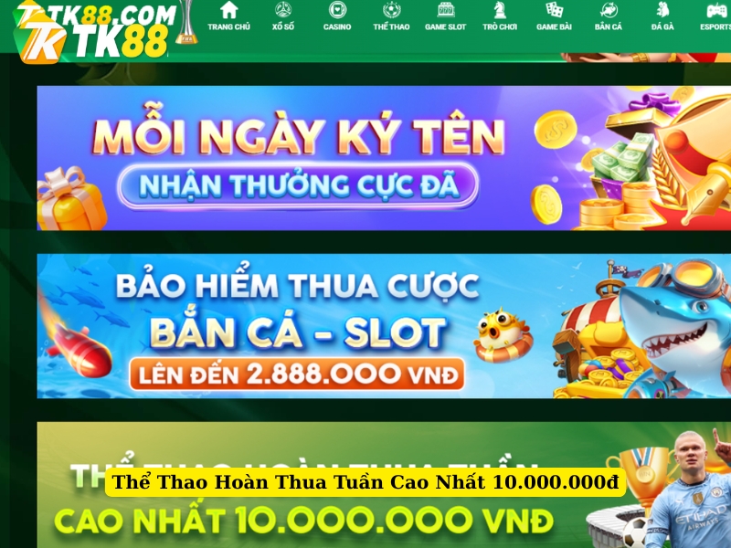 Đây là một trong những khuyến mãi lớn của TK88, nhằm hỗ trợ anh em có thêm cơ hội thử vận may trong các cược thể thao. Dù có thua cược, anh em vẫn nhận được số tiền hoàn lại lên tới 10 triệu đồng mỗi tuần. Điều này thật sự hấp dẫn, giúp anh em không cảm thấy nản lòng mà tiếp tục đặt cược và chinh phục các giải thưởng cao.