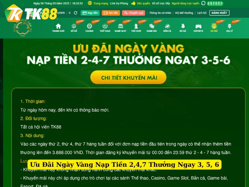 Khuyến mãi TK88 luôn có những ưu đãi hấp dẫn, nhưng ưu đãi “Ngày Vàng” mới là cơ hội không thể bỏ qua. Cứ vào các ngày 2, 4, 7 trong tháng, anh em nạp tiền vào tài khoản là sẽ được hưởng ngay phần thưởng khủng vào các ngày 3, 5, 6. Cụ thể, chỉ cần thực hiện giao dịch nạp tiền vào những ngày này, anh em sẽ được nhận thưởng ngay trong vòng 24 giờ, tạo cơ hội cho anh em thử vận may mà không phải đợi lâu.